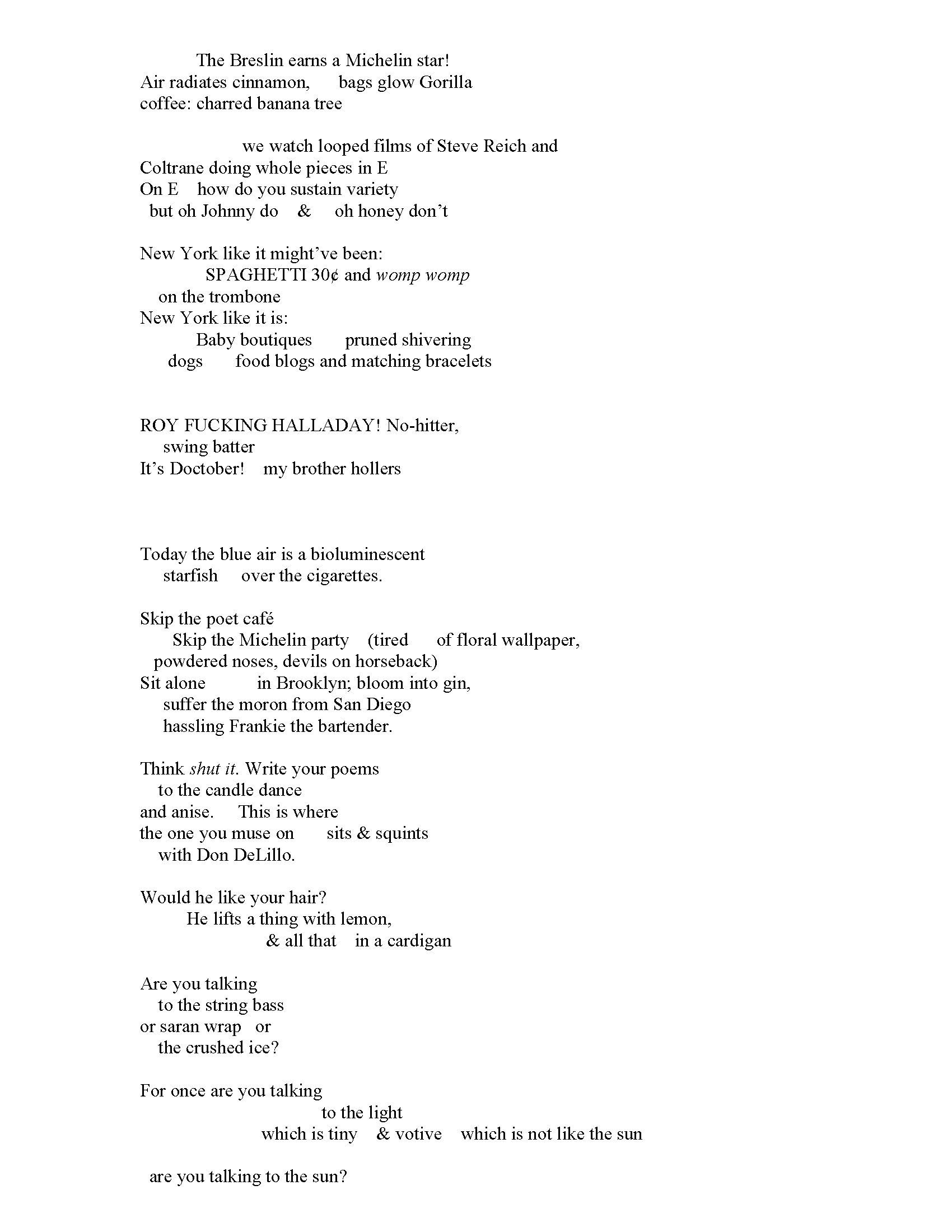 Amanda Smeltz is the author of Imperial Bender (Typecast Publishing), her debut poetry collection, which was mentioned in the Chicago Tribune’s Printer’s Row and on The Poetry Foundation as one of the notable poetry titles of 2013. She is the assistant poetry editor of Forklift, Ohio. Her work has appeared or is forthcoming in Prelude, [PANK], The Best American Poetryblog, Phantom Limb, Barrow Street, and others. Smeltz lives and works in Brooklyn.